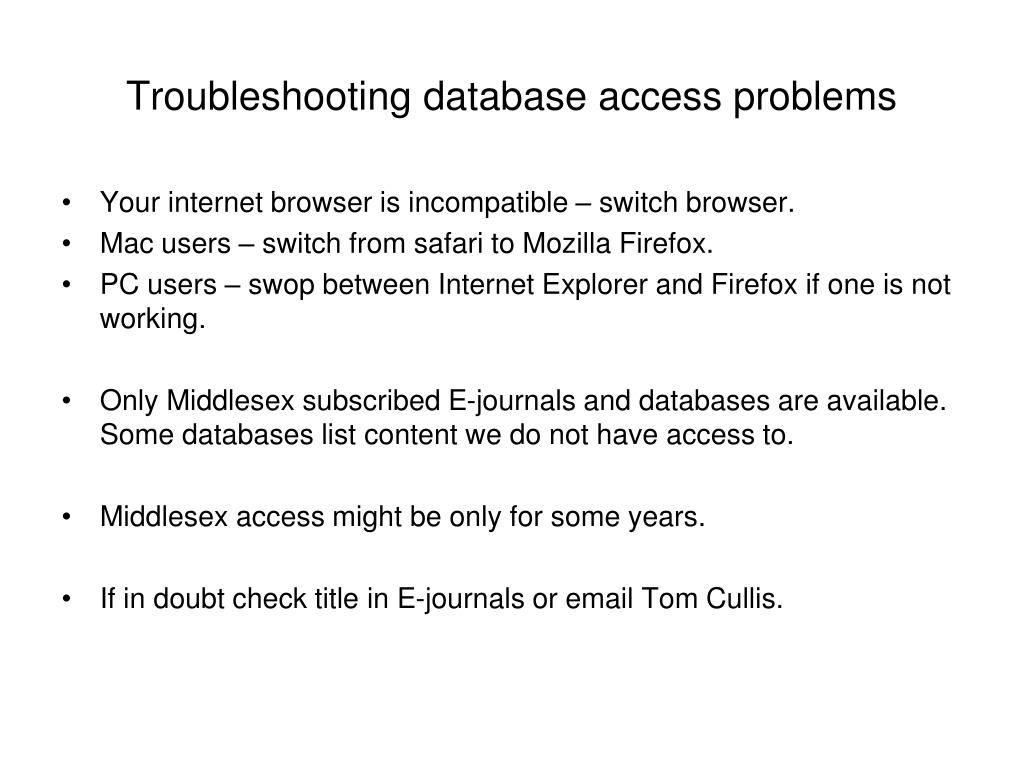 Troubleshooting database access problems • Your internet browser is incompatible – switch browser. • Mac users – switch from safari to Mozilla Firefox. • PC users – swop between Internet Explorer and Firefox if one is not working. • Only Middlesex subscribed E-journals and databases are available. Some databases list content we do not have access to. • Middlesex access might be only for some years. • If in doubt check title in E-journals or email Tom Cullis.