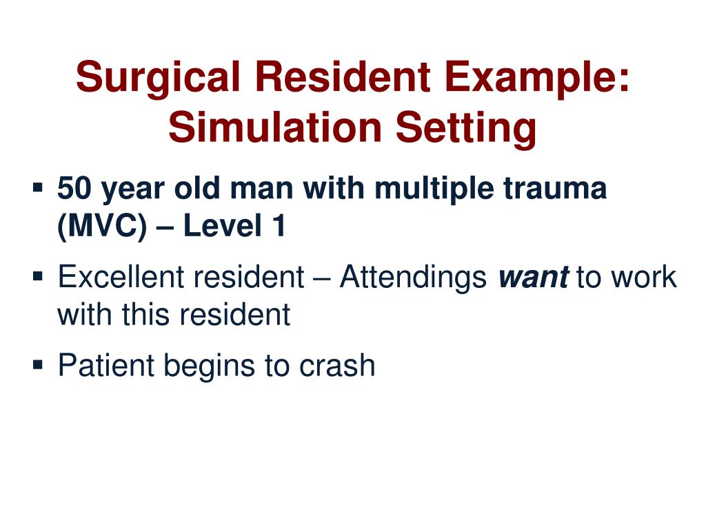 Surgical Resident Example: Simulation Setting • 50 year old man with multiple trauma (MVC) – Level 1 • Excellent resident – Attendingswantto work with this resident • Patient begins to crash