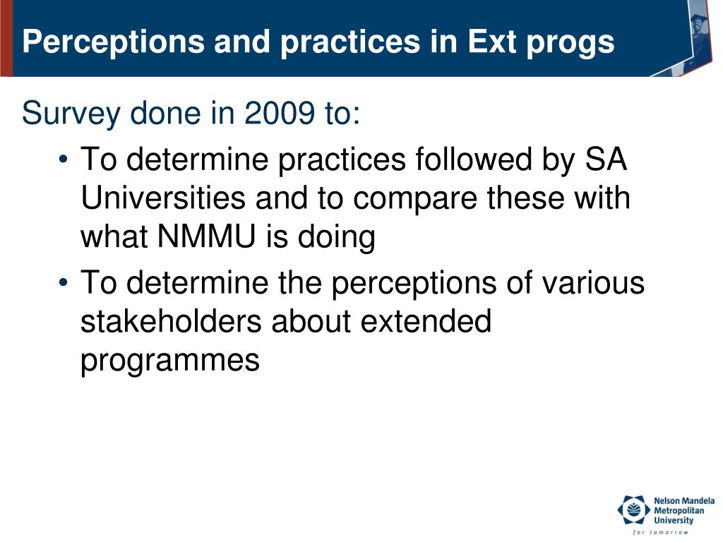 Perceptions and practices in Ext progs Survey done in 2009 to: • To determine practices followed by SA Universities and to compare these with what NMMU is doing • To determine the perceptions of various stakeholders about extended programmes