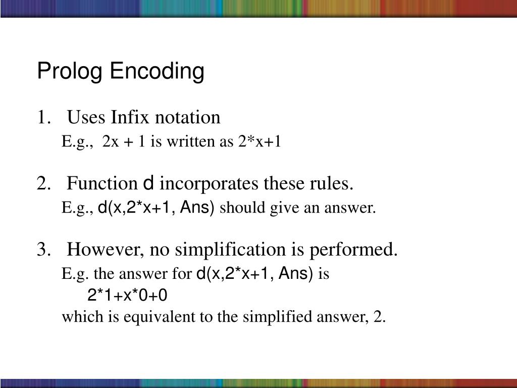 Prolog Encoding • Uses Infix notation E.g., 2x + 1 is written as 2*x+1 • Function d incorporates these rules. E.g., d(x,2*x+1, Ans) should give an answer. • However, no simplification is performed. E.g. the answer for d(x,2*x+1, Ans) is 2*1+x*0+0 which is equivalent to the simplified answer, 2.