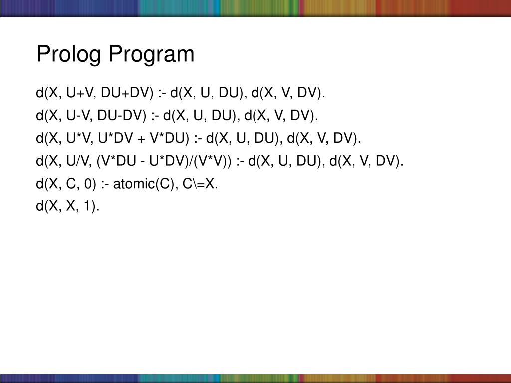 Prolog Program • d(X, U+V, DU+DV) :- d(X, U, DU), d(X, V, DV). • d(X, U-V, DU-DV) :- d(X, U, DU), d(X, V, DV). • d(X, U*V, U*DV + V*DU) :- d(X, U, DU), d(X, V, DV). • d(X, U/V, (V*DU - U*DV)/(V*V)) :- d(X, U, DU), d(X, V, DV). • d(X, C, 0) :- atomic(C), C\=X. • d(X, X, 1).