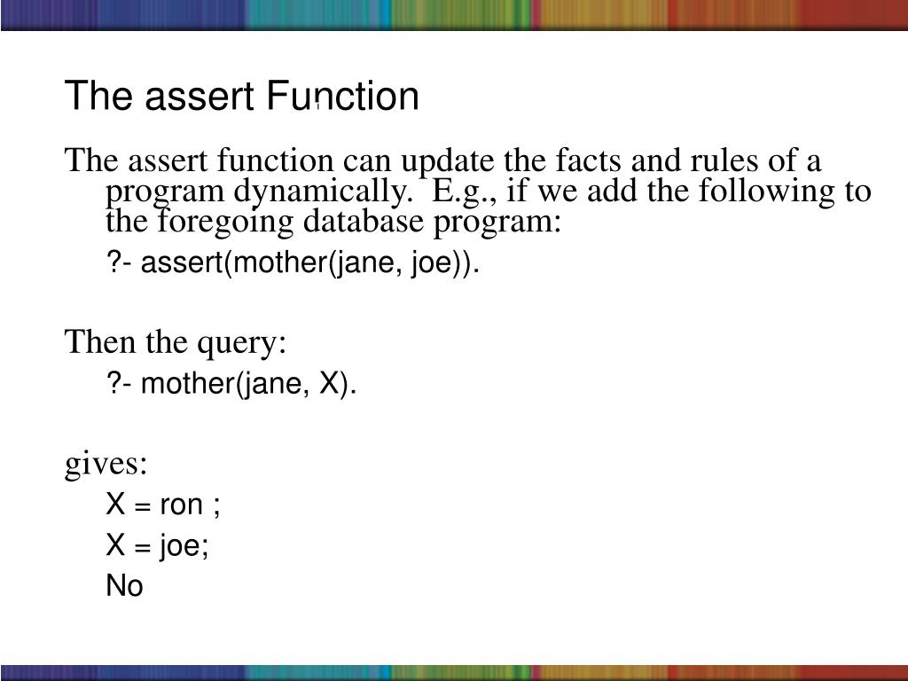 The assert Function F • The assert function can update the facts and rules of a program dynamically. E.g., if we add the following to the foregoing database program: • ?- assert(mother(jane, joe)). • Then the query: • ?- mother(jane, X). • gives: • X = ron ; • X = joe; • No