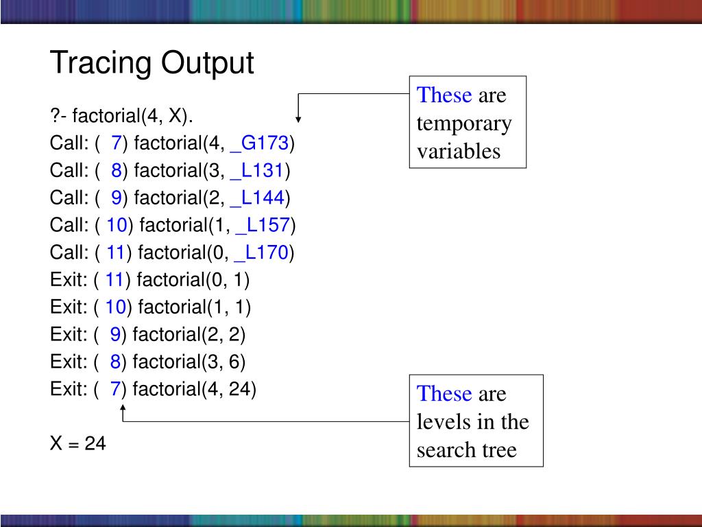 Tracing Output These are temporary variables • ?- factorial(4, X). • Call: ( 7) factorial(4, _G173) • Call: ( 8) factorial(3, _L131) • Call: ( 9) factorial(2, _L144) • Call: ( 10) factorial(1, _L157) • Call: ( 11) factorial(0, _L170) • Exit: ( 11) factorial(0, 1) • Exit: ( 10) factorial(1, 1) • Exit: ( 9) factorial(2, 2) • Exit: ( 8) factorial(3, 6) • Exit: ( 7) factorial(4, 24) • X = 24 These are levels in the search tree