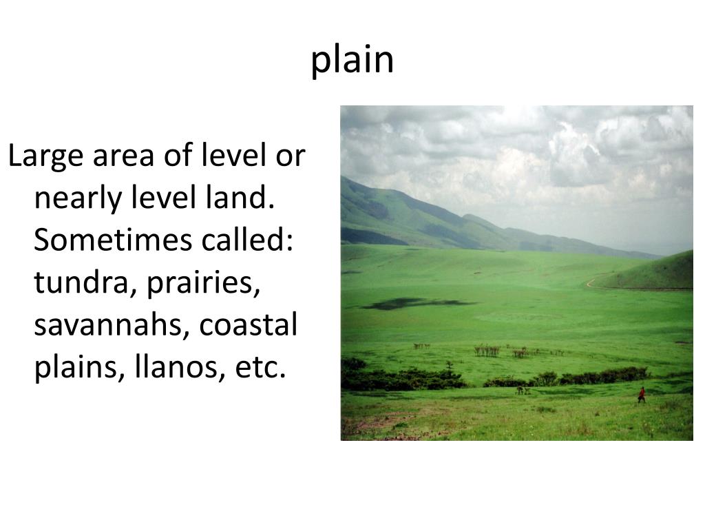 plain Large area of level or nearly level land. Sometimes called: tundra, prairies, savannahs, coastal plains, llanos, etc.