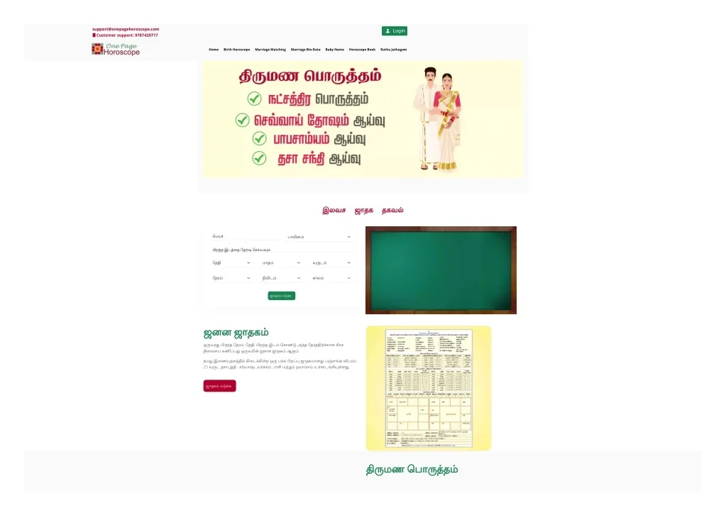 support@onepagehoroscope.com Customer support: 9787420717 Login Home Birth Horoscope Marriage Matching Marriage Bio-Data Baby Name Horoscope Book Ruthu Jathagam இலவசஜாதகதகவ? ெபய? பா?ன? ?ற?தஇட?ைதேத??ெச?ய?? ேத? மாத? வ?ட? ேநர? ??ட? கால? ஜாதக?எ??க ஜனனஜாதக? ஒ?வர??ற?தேநர?, ேத?, ?ற?தஇட?ெகா??அ?தேநர????கான?ரக ?ைலையக??ப?ஒ?வ??ஜனனஜாதக?ஆ??. நம?இைணயதள????ைட???றஒ?ப?க?ற??ஜாதகமான?ப?சா?க?பர? , 25 வ?டதசா??? , ச?வா?டவ??க? , ரா?ம???நவா?ச?உ?ளட????ள?. ஜாதக?எ??க ??மணெபா??த?