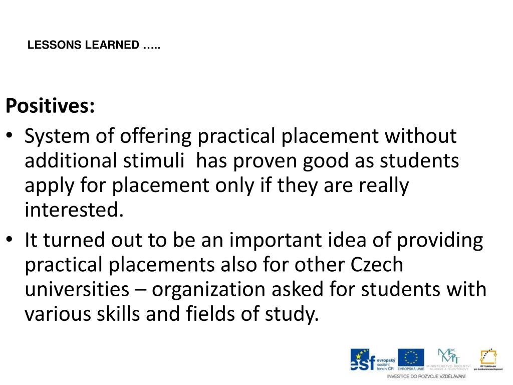 LESSONS LEARNED ….. Positives: • System of offering practical placement without additional stimuli has proven good as students apply for placement only if they are really interested. • It turned out to be an important idea of providing practical placements also for other Czech universities – organization asked for students with various skills and fields of study.