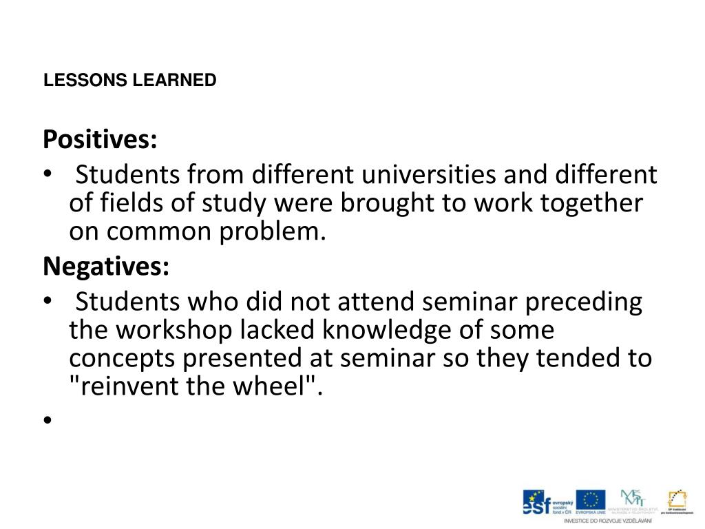 LESSONS LEARNED Negatives: • There is very good linkage between practical placements and seminars. On the other hand much worse linkage is between seminars and workshops. • This caused problems as many workshop attendees lacked understanding of concepts presented at the seminar.