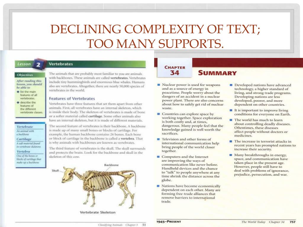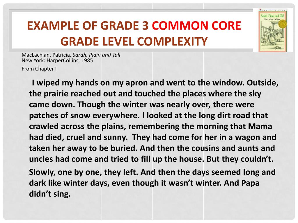 Example of Grade 3 Common Core Grade Level Complexity MacLachlan, Patricia. Sarah, Plain and Tall New York: HarperCollins, 1985 From Chapter I I wiped my hands on my apron and went to the window. Outside, the prairie reached out and touched the places where the sky came down. Though the winter was nearly over, there were patches of snow everywhere. I looked at the long dirt road that crawled across the plains, remembering the morning that Mama had died, cruel and sunny. They had come for her in a wagon and taken her away to be buried. And then the cousins and aunts and uncles had come and tried to fill up the house. But they couldn’t. Slowly, one by one, they left. And then the days seemed long and dark like winter days, even though it wasn’t winter. And Papa didn’t sing.