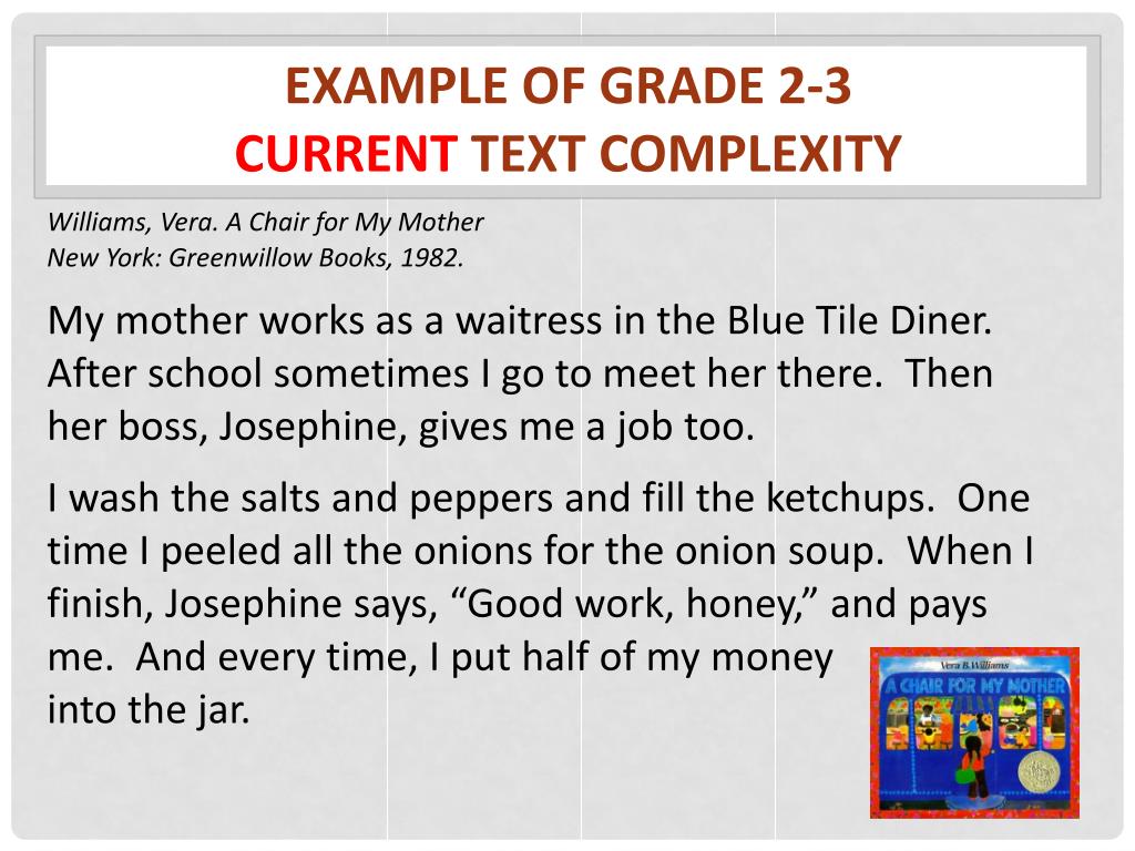 Example of Grade 2-3 CurrentText Complexity Williams, Vera. A Chair for My Mother New York: Greenwillow Books, 1982. My mother works as a waitress in the Blue Tile Diner. After school sometimes I go to meet her there. Then her boss, Josephine, gives me a job too. I wash the salts and peppers and fill the ketchups. One time I peeled all the onions for the onion soup. When I finish, Josephine says, “Good work, honey,” and pays me. And every time, I put half of my money into the jar.