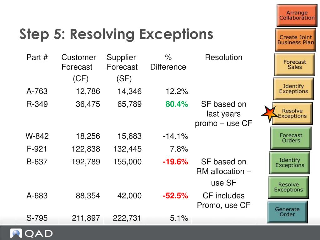 Step 4: Identify Exceptions Two sales forecasts reviewed against exception criteria Differences within exception criteria – no problem Differences exceeding exception criteria – demand planner & buyer must resolve