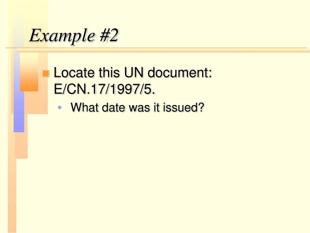 Example #2 • Locate this UN document: E/CN.17/1997/5. • What date was it issued?