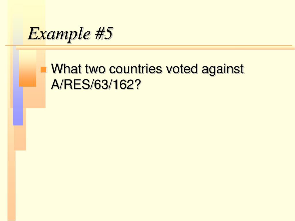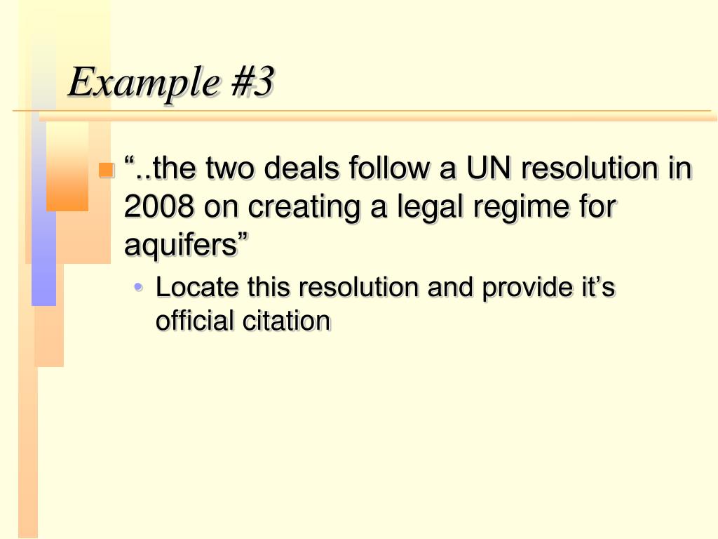 Example #3 • “..the two deals follow a UN resolution in 2008 on creating a legal regime for aquifers” • Locate this resolution and provide it’s official citation