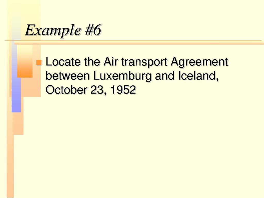Example #6 • Locate the Air transport Agreement between Luxemburg and Iceland, October 23, 1952