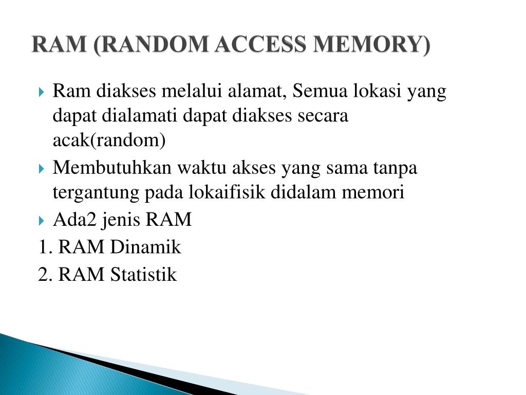 RAM (RANDOM ACCESS MEMORY) • Ram diaksesmelaluialamat, Semualokasi yang dapatdialamatidapatdiaksessecaraacak(random) • Membutuhkanwaktuakses yang samatanpatergantungpadalokaifisikdidalammemori • Ada2 jenis RAM 1. RAM Dinamik 2. RAM Statistik