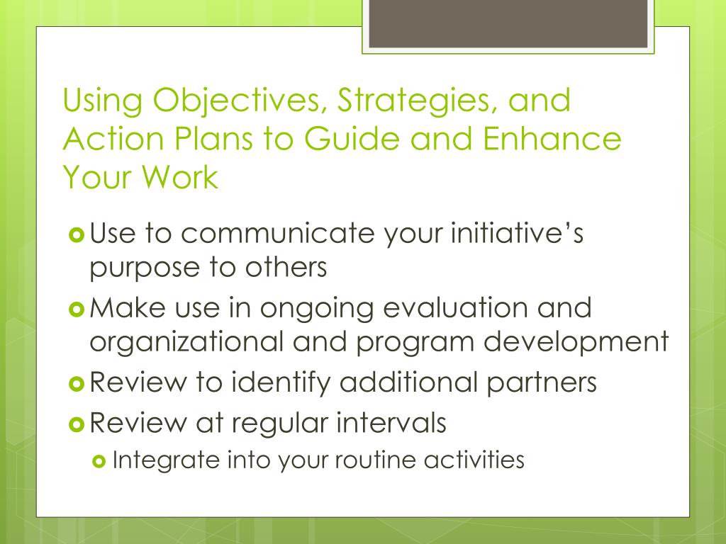 Using Objectives, Strategies, and Action Plans to Guide and Enhance Your Work • Use to communicate your initiative’s purpose to others • Make use in ongoing evaluation and organizational and program development • Review to identify additional partners • Review at regular intervals • Integrate into your routine activities