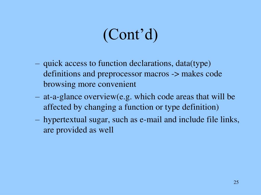 (Cont’d) • quick access to function declarations, data(type) definitions and preprocessor macros -> makes code browsing more convenient • at-a-glance overview(e.g. which code areas that will be affected by changing a function or type definition) • hypertextual sugar, such as e-mail and include file links, are provided as well