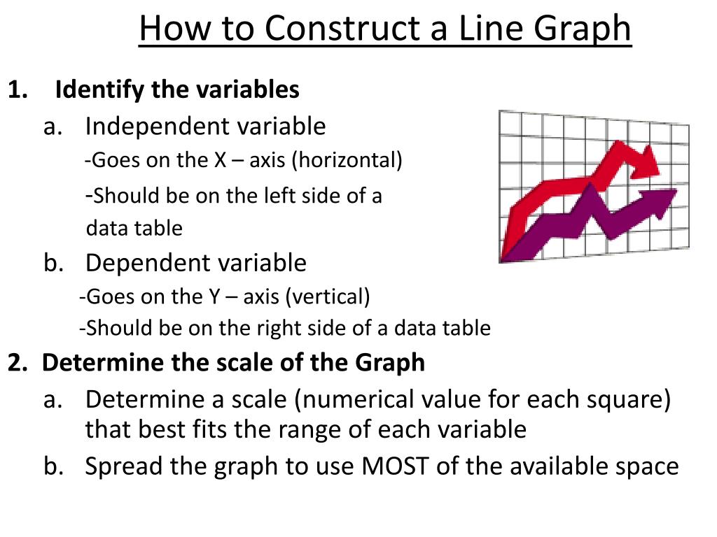 How to Construct a Line Graph • Identify the variables • Independent variable -Goes on the X – axis (horizontal) -Should be on the left side of a data table • Dependent variable -Goes on the Y – axis (vertical) -Should be on the right side of a data table 2.Determine the scale of the Graph • Determine a scale (numerical value for each square) that best fits the range of each variable • Spread the graph to use MOST of the available space