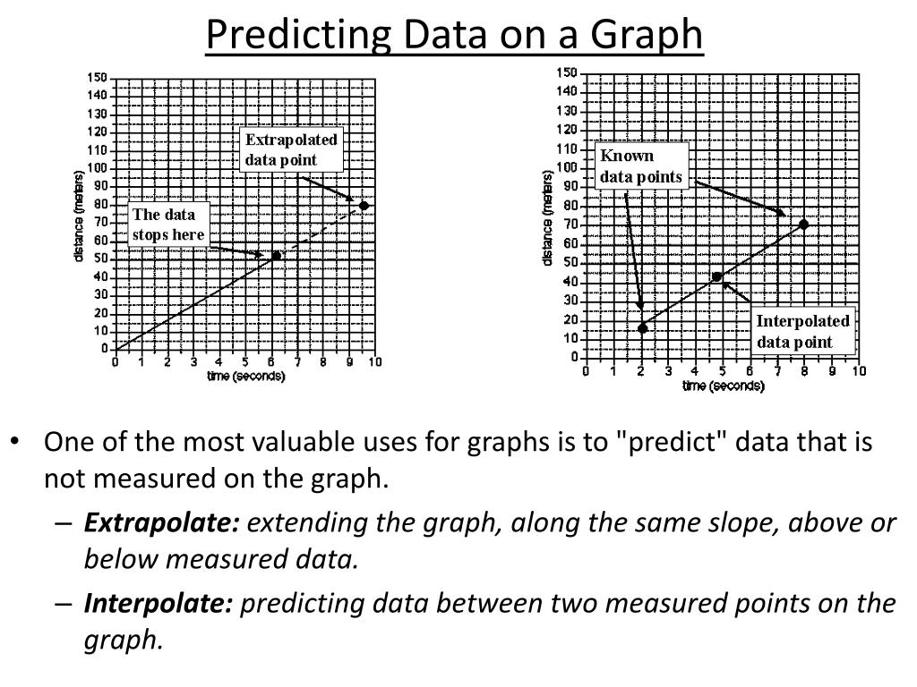 Predicting Data on a Graph • One of the most valuable uses for graphs is to "predict" data that is not measured on the graph. • Extrapolate: extending the graph, along the same slope, above or below measured data. • Interpolate: predicting data between two measured points on the graph.