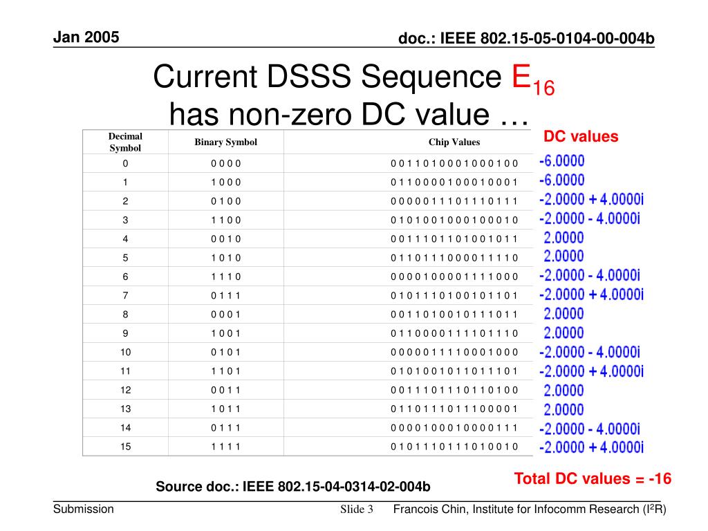 Decimal Symbol Binary Symbol Chip Values 0 0 0 0 0 0 0 1 1 0 1 0 0 0 1 0 0 0 1 0 0 1 1 0 0 0 0 1 1 0 0 0 0 1 0 0 0 1 0 0 0 1 2 0 1 0 0 0 0 0 0 0 1 1 1 0 1 1 1 0 1 1 1 3 1 1 0 0 0 1 0 1 0 0 1 0 0 0 1 0 0 0 1 0 4 0 0 1 0 0 0 1 1 1 0 1 1 0 1 0 0 1 0 1 1 5 1 0 1 0 0 1 1 0 1 1 1 0 0 0 0 1 1 1 1 0 6 1 1 1 0 0 0 0 0 1 0 0 0 0 1 1 1 1 0 0 0 7 0 1 1 1 0 1 0 1 1 1 0 1 0 0 1 0 1 1 0 1 8 0 0 0 1 0 0 1 1 0 1 0 0 1 0 1 1 1 0 1 1 9 1 0 0 1 0 1 1 0 0 0 0 1 1 1 1 0 1 1 1 0 10 0 1 0 1 0 0 0 0 0 1 1 1 1 0 0 0 1 0 0 0 11 1 1 0 1 0 1 0 1 0 0 1 0 1 1 0 1 1 1 0 1 12 0 0 1 1 0 0 1 1 1 0 1 1 1 0 1 1 0 1 0 0 13 1 0 1 1 0 1 1 0 1 1 1 0 1 1 1 0 0 0 0 1 14 0 1 1 1 0 0 0 0 1 0 0 0 1 0 0 0 0 1 1 1 15 1 1 1 1 0 1 0 1 1 1 0 1 1 1 0 1 0 0 1 0 Current DSSS Sequence E16 has non-zero DC value …. DC values Total DC values = -16 • Source doc.: IEEE 802.15-04-0314-02-004b Francois Chin, Institute for Infocomm Research (I2R)