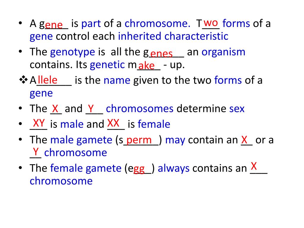wo ene enes • A g____ is part of a chromosome.T___ formsof a gene control each inheritedcharacteristic • The genotypeis all the g______ an organism contains. Its genetic m____ - up. • A______ is the name given to the two forms of a gene • The __ and ___ chromosomes determine sex • ___ is male and ___ is female • The male gamete (s______) may contain an __ or a __ chromosome • The female gamete (e___) always contains an ___ chromosome ake llele X Y XY XX perm X Y X gg