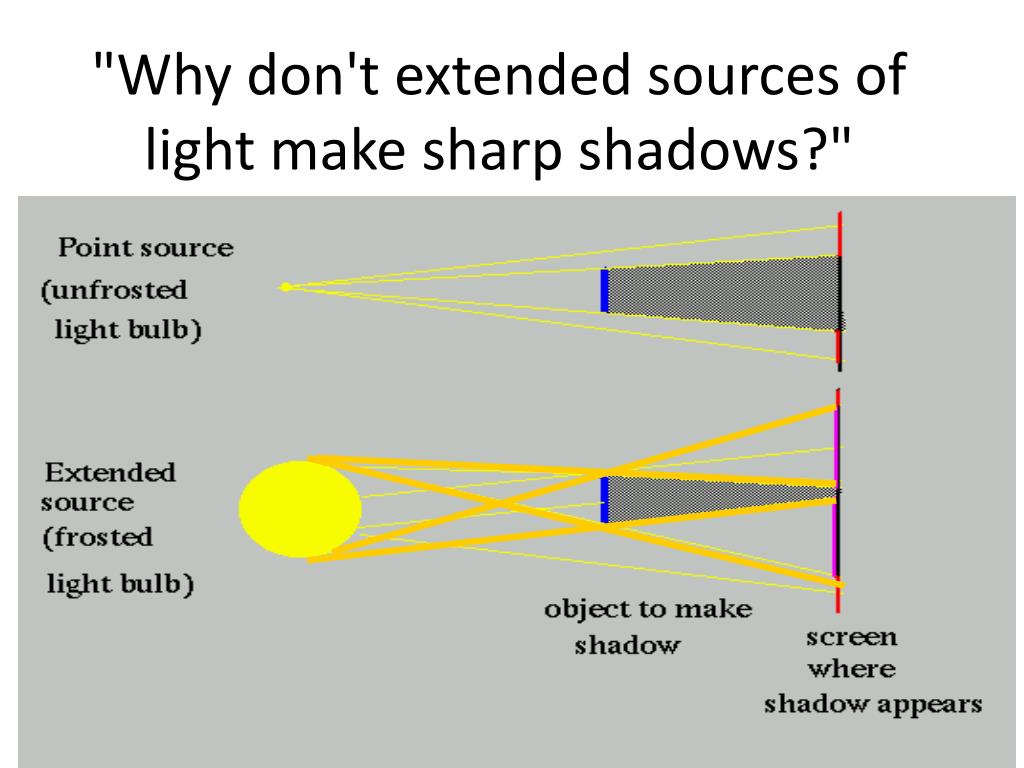 "Why don't extended sources of light make sharp shadows?" • What is the difference between a point source of light and an extended source of light? How come when a point source of light is used to cast a shadow, the shadow is totally dark whereas with an extended source of light an umbra and penumbra result? Sally's explanation An extended source is like a frosted light bulb -- light comes from many places, and at any point in space there is light going different directions. A point source is a very small source, so that now there is just one point that the light comes from. Of course, all light sources are to some extent extended, though I have one made from a laser pointer for which the source certainly is very tiny. For many purposes, an unfrosted light bulb is a good approximation to a point source. As you observe, point sources give sharp shadows, while extended sources give fuzzy-edged ones (that is already the distinction between them!). Here is a picture that explains how this comes about: Light travels in straight lines from the source, in many directions. In the top picture the blue object is making a sharp-edged shadow on the screen, because either there is a path for light to take from the light source to the screen or there is not. I have indicated the region of (total) shadow by shading it, and indicated the part of the screen that is lit by coloring it red. In the bottom picture I have drawn some lines from various parts of the light source. We observe that some parts of the screen are illuminated by all of the light source (colored in red again), some regions receive no light at all (shaded again), and some regions are illuminated by part of the light bulb but not all of it. I colored this part of the screen purple. Here are pictures of a clear bulb (almost a point source) and a frosted bulb (an extended source), and shadows made by them. On the subsequent pages, you can see what a bug sitting on the screen would see, looking back at the bulb. This is another way of understanding why the extended source has a penumbra that is neither light nor dark -- these regions can only see part of the light bulb.