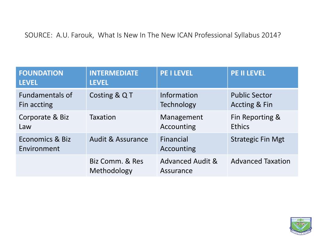 SOURCE: A.U. Farouk, What Is New In The New ICAN Professional Syllabus 2014?