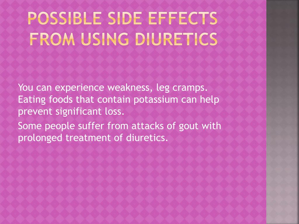 You can experience weakness, leg cramps. Eating foods that contain potassium can help prevent significant loss. Some people suffer from attacks of gout with prolonged treatment of diuretics. Possible side effects from using diuretics