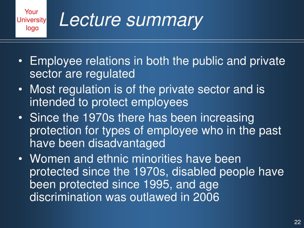 Employee relations in both the public and private sector are regulated Most regulation is of the private sector and is intended to protect employees Since the 1970s there has been increasing protection for types of employee who in the past have been disadvantaged Women and ethnic minorities have been protected since the 1970s, disabled people have been protected since 1995, and age discrimination was outlawed in 2006 Lecture summary
