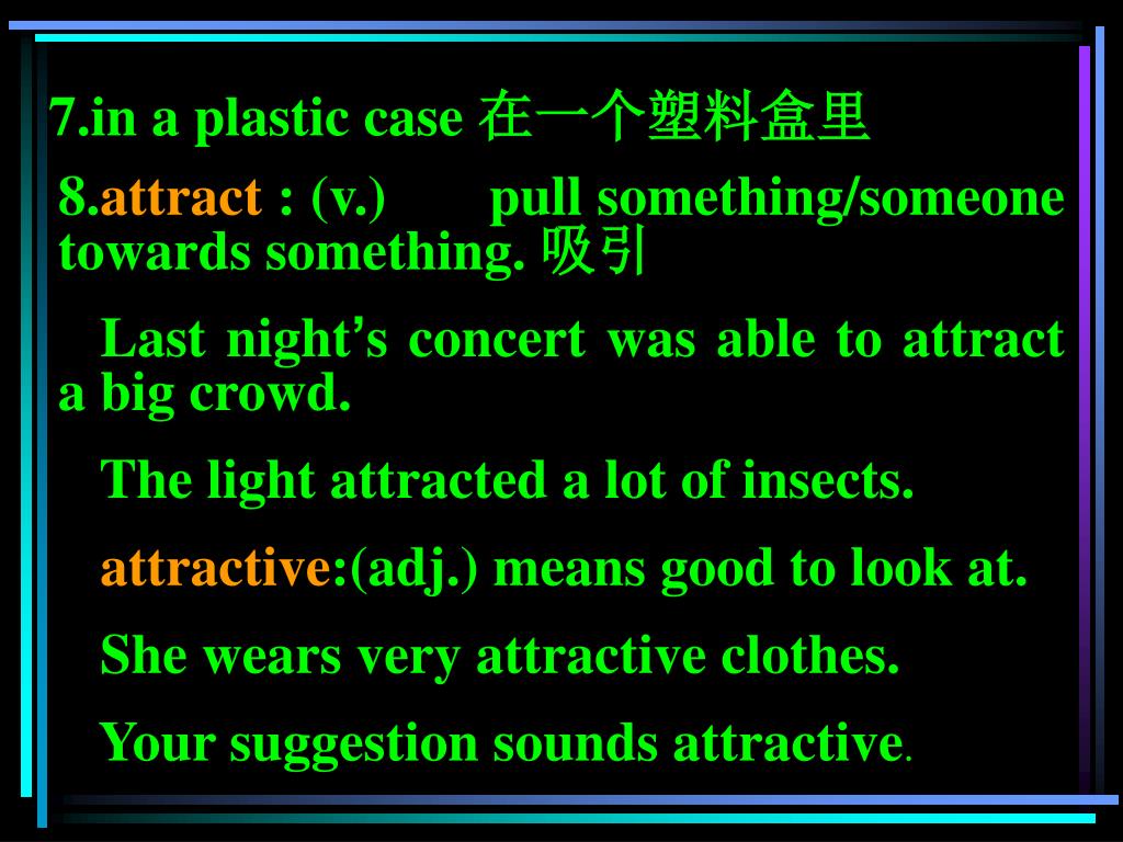 7.in a plastic case 在一个塑料盒里 8.attract : (v.) pull something/someone towards something. 吸引 Last night’s concert was able to attract a big crowd. The light attracted a lot of insects. attractive:(adj.) means good to look at. She wears very attractive clothes. Your suggestion sounds attractive.