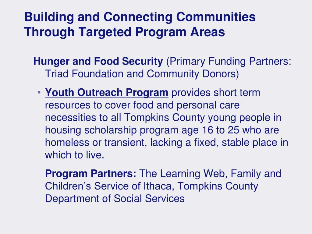 Building and Connecting Communities Through Targeted Program Areas • Hunger and Food Security (Primary Funding Partners: Triad Foundation and Community Donors) • Youth Outreach Programprovides short term resources to cover food and personal care necessities to all Tompkins County young people in housing scholarship program age 16 to 25 who are homeless or transient, lacking a fixed, stable place in which to live. Program Partners: The Learning Web, Family and Children’s Service of Ithaca, Tompkins County Department of Social Services