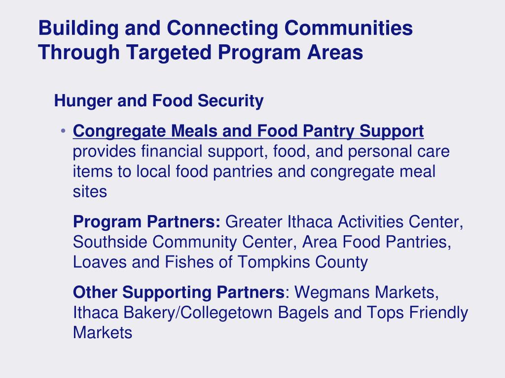 Building and Connecting Communities Through Targeted Program Areas • Hunger and Food Security • Congregate Meals and Food Pantry Support provides financial support, food, and personal care items to local food pantries and congregate meal sites Program Partners: Greater Ithaca Activities Center, Southside Community Center, Area Food Pantries, Loaves and Fishes of Tompkins County Other Supporting Partners: Wegmans Markets, Ithaca Bakery/Collegetown Bagels and Tops Friendly Markets