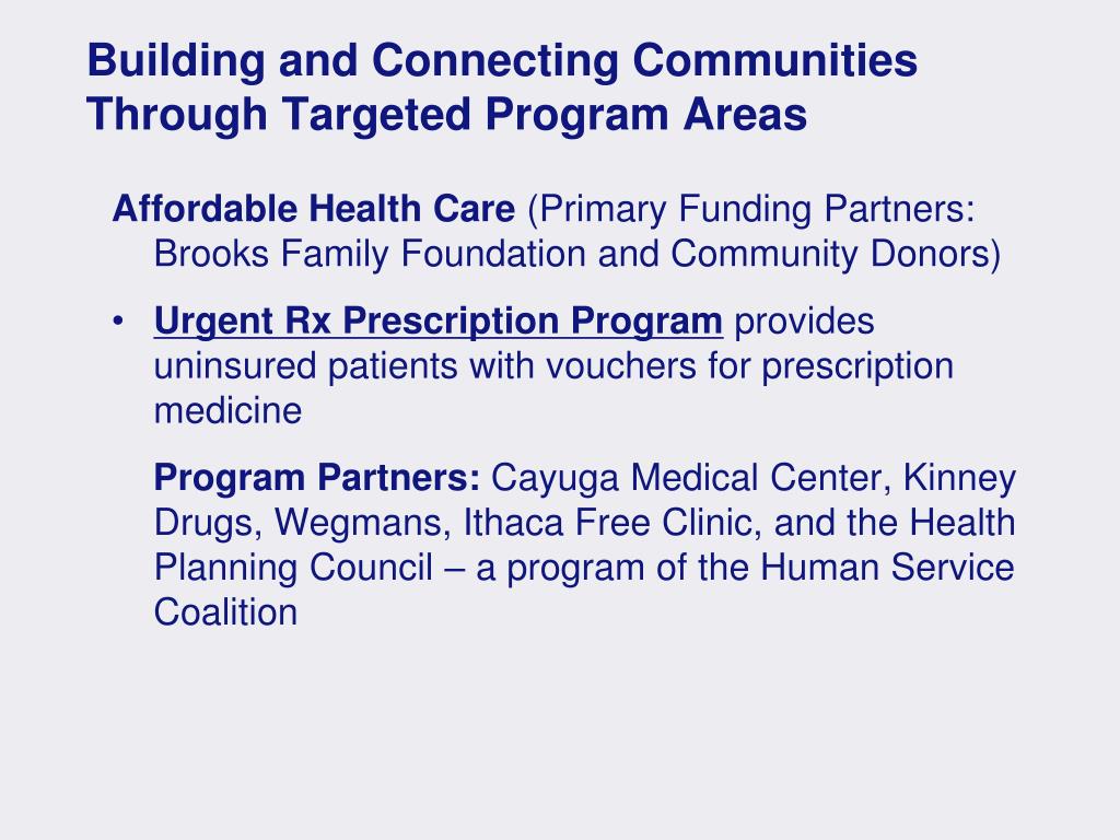 Building and Connecting Communities Through Targeted Program Areas • Affordable Health Care (Primary Funding Partners: Brooks Family Foundation and Community Donors) • Urgent Rx Prescription Program provides uninsured patients with vouchers for prescription medicine • Program Partners: Cayuga Medical Center, Kinney Drugs, Wegmans, Ithaca Free Clinic, and the Health Planning Council – a program of the Human Service Coalition