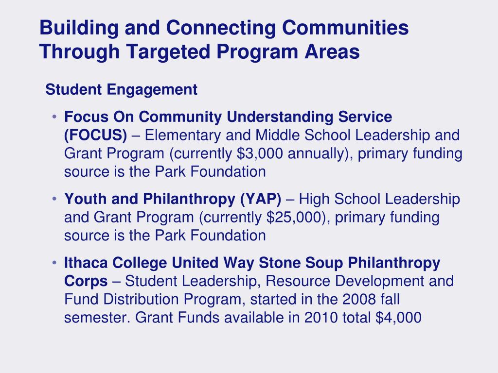 Building and Connecting Communities Through Targeted Program Areas • Student Engagement • Focus On Community Understanding Service (FOCUS) – Elementary and Middle School Leadership and Grant Program (currently $3,000 annually), primary funding source is the Park Foundation • Youth and Philanthropy (YAP) – High School Leadership and Grant Program (currently $25,000), primary funding source is the Park Foundation • Ithaca College United Way Stone Soup Philanthropy Corps – Student Leadership, Resource Development and Fund Distribution Program, started in the 2008 fall semester. Grant Funds available in 2010 total $4,000