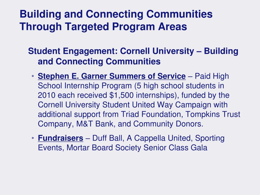Building and Connecting Communities Through Targeted Program Areas • Student Engagement: Cornell University – Building and Connecting Communities • Stephen E. Garner Summers of Service – Paid High School Internship Program (5 high school students in 2010 each received $1,500 internships), funded by the Cornell University Student United Way Campaign with additional support from Triad Foundation, Tompkins Trust Company, M&T Bank, and Community Donors. • Fundraisers– Duff Ball, A Cappella United, Sporting Events, Mortar Board Society Senior Class Gala
