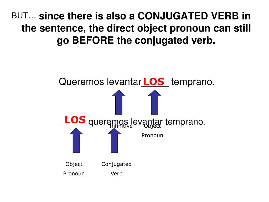 since there is also a CONJUGATED VERB in the sentence, the direct object pronoun can still go BEFORE the conjugated verb. BUT… Queremos levantar_____ temprano. LOS LOS _____ queremos levantar temprano. Infinitive Object Pronoun Object Pronoun Conjugated Verb