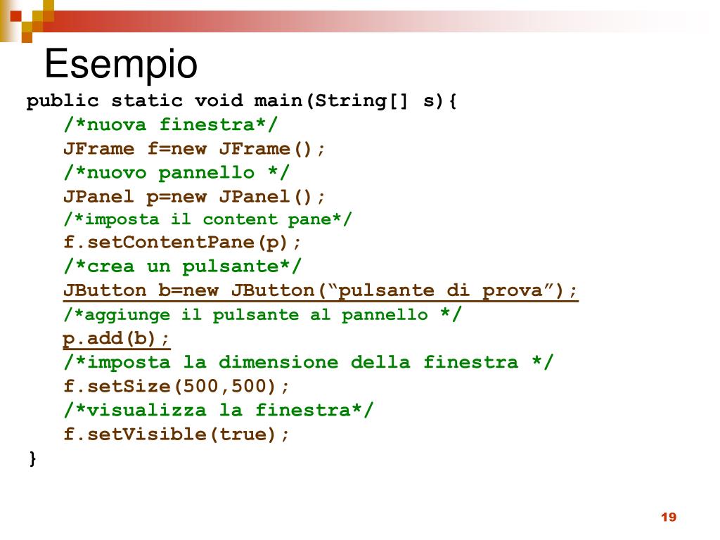 Esempio public static void main(String[] s){ /*nuova finestra*/ JFrame f=new JFrame(); /*nuovo pannello */ JPanel p=new JPanel(); /*imposta il content pane*/ f.setContentPane(p); /*crea un pulsante*/ JButton b=new JButton(“pulsante di prova”); /*aggiunge il pulsante al pannello */ p.add(b); /*imposta la dimensione della finestra */ f.setSize(500,500); /*visualizza la finestra*/ f.setVisible(true); }