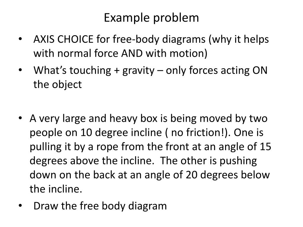 Example problem • AXIS CHOICE for free-body diagrams (why it helps with normal force AND with motion) • What’s touching + gravity – only forces acting ON the object • A very large and heavy box is being moved by two people on 10 degree incline ( no friction!). One is pulling it by a rope from the front at an angle of 15 degrees above the incline. The other is pushing down on the back at an angle of 20 degrees below the incline. • Draw the free body diagram
