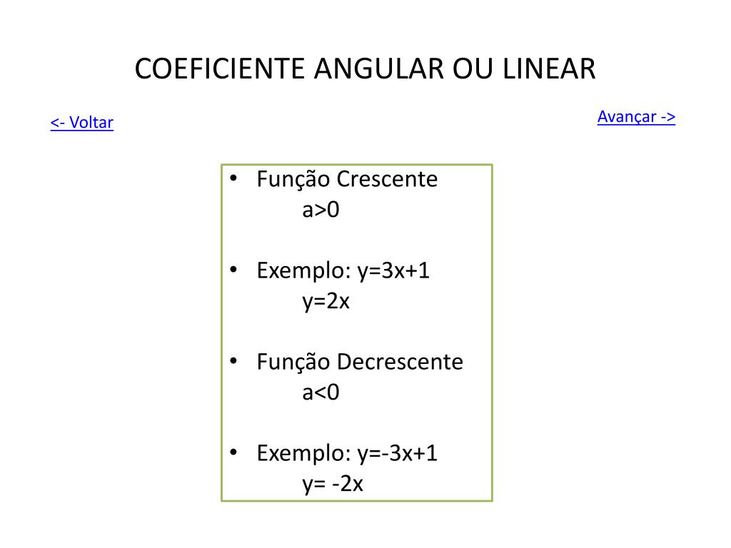 COEFICIENTE ANGULAR OU LINEAR Avançar -> <- Voltar • Função Crescente a>0 • Exemplo: y=3x+1 y=2x • Função Decrescente a<0 • Exemplo: y=-3x+1 y= -2x