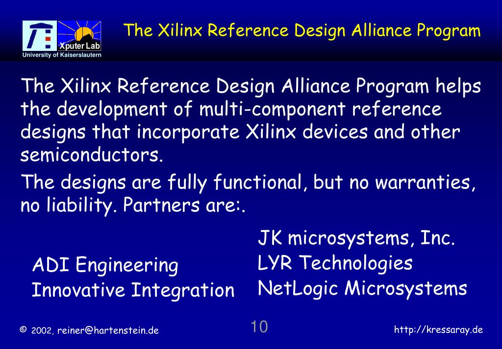 The Xilinx Reference Design Alliance Program The Xilinx Reference Design Alliance Program helps the development of multi-component reference designs that incorporate Xilinx devices and other semiconductors. The designs are fully functional, but no warranties, no liability. Partners are:. JK microsystems, Inc. LYR Technologies NetLogic Microsystems ADI Engineering Innovative Integration 10