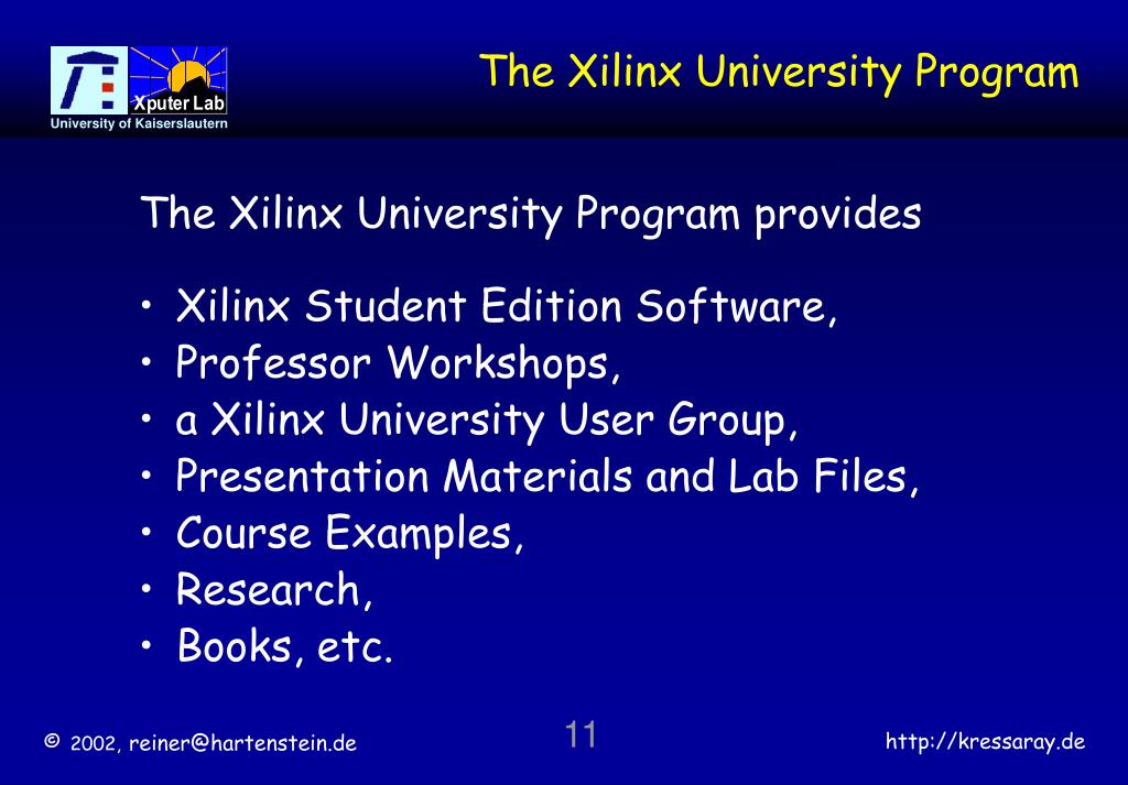 The Xilinx University Program The Xilinx University Program provides • Xilinx Student Edition Software, • Professor Workshops, • a Xilinx University User Group, • Presentation Materials and Lab Files, • Course Examples, • Research, • Books, etc. 11