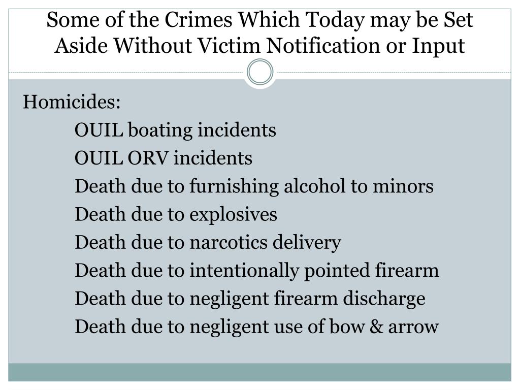 Some of the Crimes Which Today may be Set Aside Without Victim Notification or Input Homicides: OUIL boating incidents OUIL ORV incidents Death due to furnishing alcohol to minors Death due to explosives Death due to narcotics delivery Death due to intentionally pointed firearm Death due to negligent firearm discharge Death due to negligent use of bow & arrow