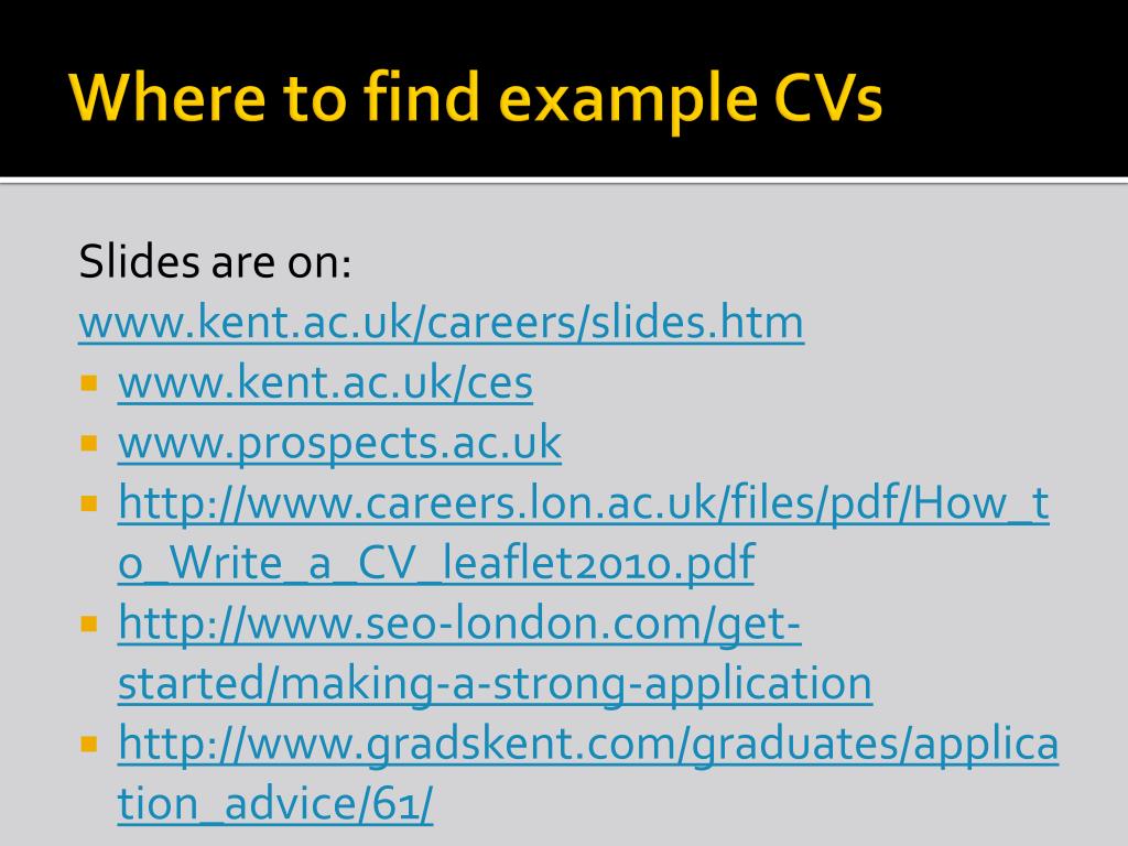 Where to find example CVs Slides are on: www.kent.ac.uk/careers/slides.htm • www.kent.ac.uk/ces • www.prospects.ac.uk • http://www.careers.lon.ac.uk/files/pdf/How_to_Write_a_CV_leaflet2010.pdf • http://www.seo-london.com/get-started/making-a-strong-application • http://www.gradskent.com/graduates/application_advice/61/