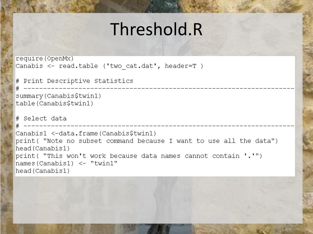 Two approaches to the liability threshold model • Solution? • Traditional • Maps data to a standard normal distribution • Total variance constrained to be 1 • Alternate • Fixes an alternate parameter • Binary or Ordinal data fix E • Ordinal data fix 1st two thresholds (aka invariant threshold approach) • Estimate the remaining parameters