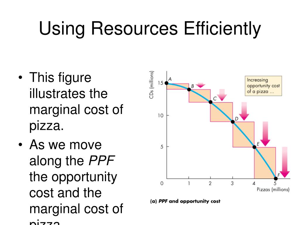 Using Resources Efficiently • This figure illustrates the marginal cost of pizza. • As we move along the PPF the opportunity cost and the marginal cost of pizza increases.