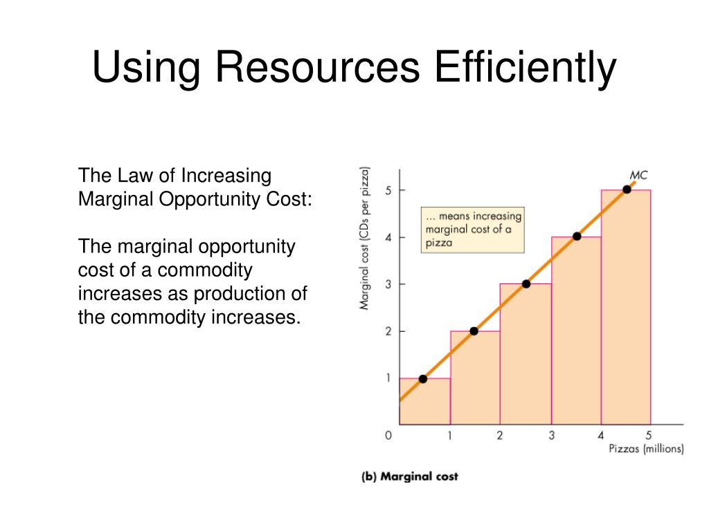 Using Resources Efficiently • The Law of Increasing Marginal Opportunity Cost: • The marginal opportunity cost of a commodity increases as production of the commodity increases.