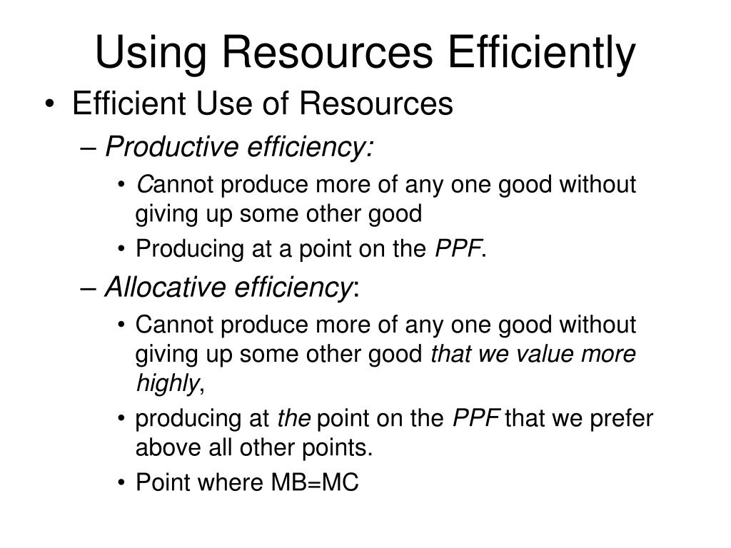 Using Resources Efficiently • Efficient Use of Resources • Productive efficiency: • Cannot produce more of any one good without giving up some other good • Producing at a point on the PPF. • Allocative efficiency: • Cannot produce more of any one good without giving up some other good that we value more highly, • producing at the point on the PPF that we prefer above all other points. • Point where MB=MC