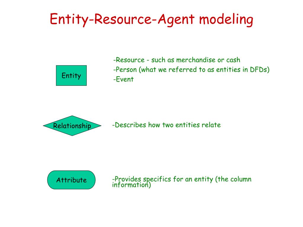 Entity-Resource-Agent modeling • Resource - such as merchandise or cash • Person (what we referred to as entities in DFDs) • Event Entity Relationship • Describes how two entities relate Attribute • Provides specifics for an entity (the column information)