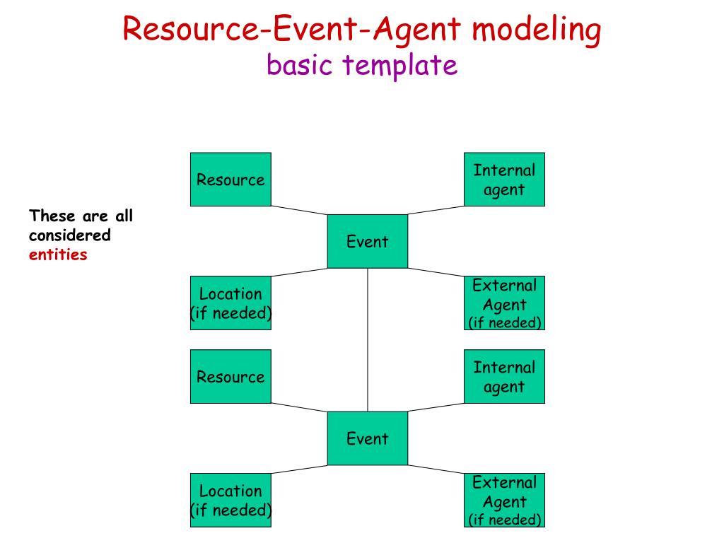 Resource-Event-Agent modelingbasic template Resource Internal agent Event Location (if needed) External Agent (if needed) Resource Internal agent These are all considered entities Event Location (if needed) External Agent (if needed)