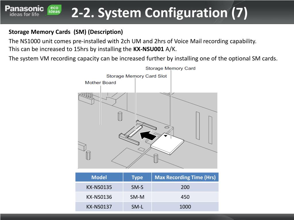 2-2. System Configuration (7) • Storage Memory Cards (SM) (Description) • The NS1000 unit comes pre-installed with 2ch UM and 2hrs of Voice Mail recording capability. This can be increased to 15hrs by installing the KX-NSU001 A/K. • The system VM recording capacity can be increased further by installing one of the optional SM cards.