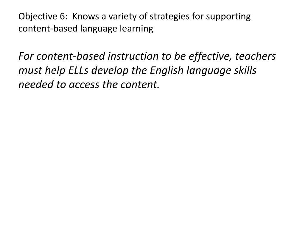 Objective 6: Knows a variety of strategies for supporting content-based language learning For content-based instruction to be effective, teachers must help ELLs develop the English language skills needed to access the content.